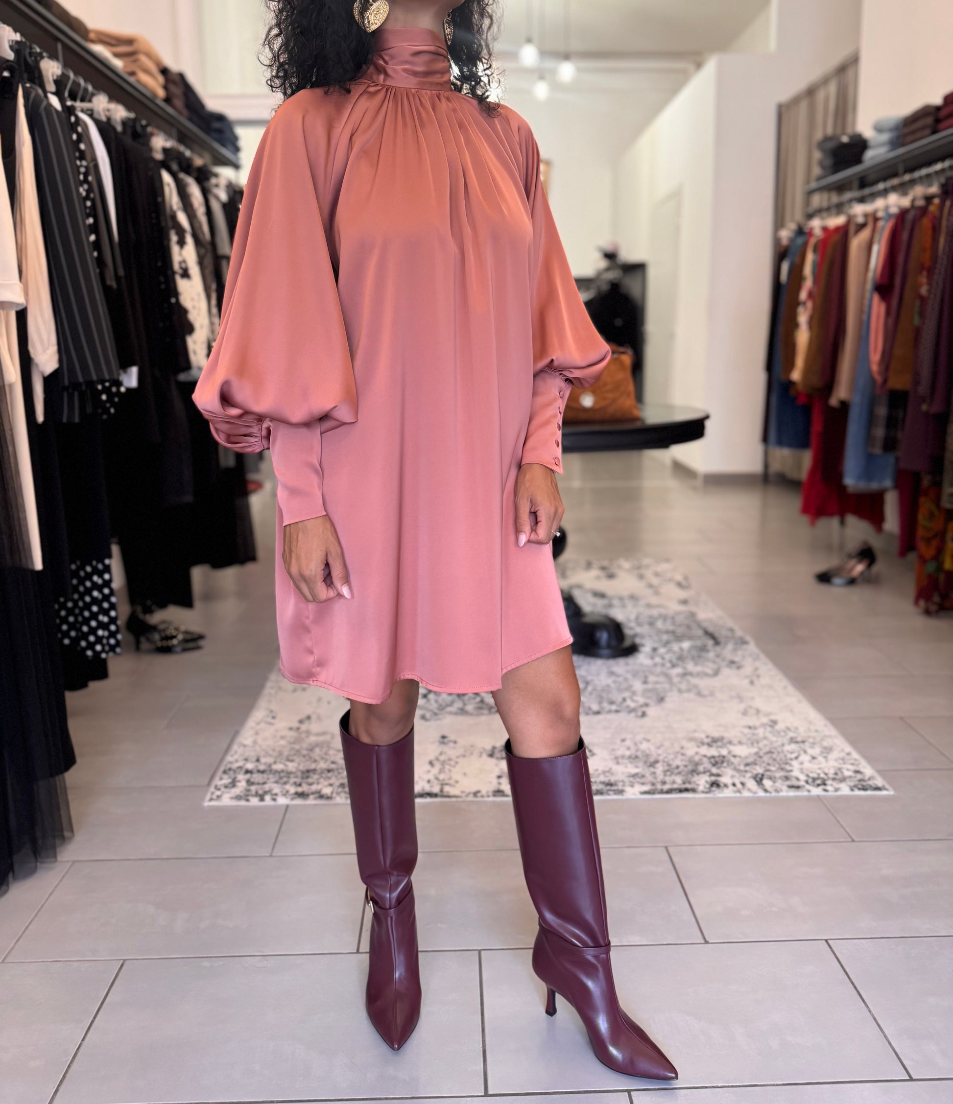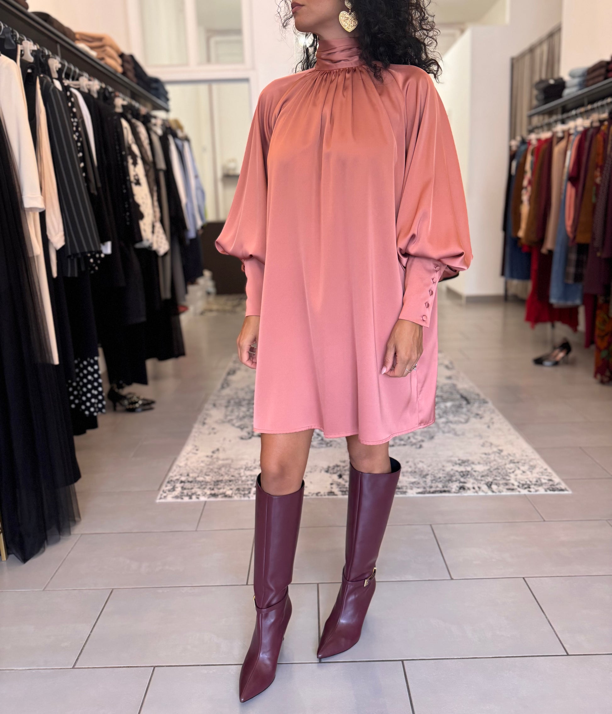 Colore onion, collo a scialle che si lega dietro o si lascia morbido sul davanti . Polso con bottoncini .