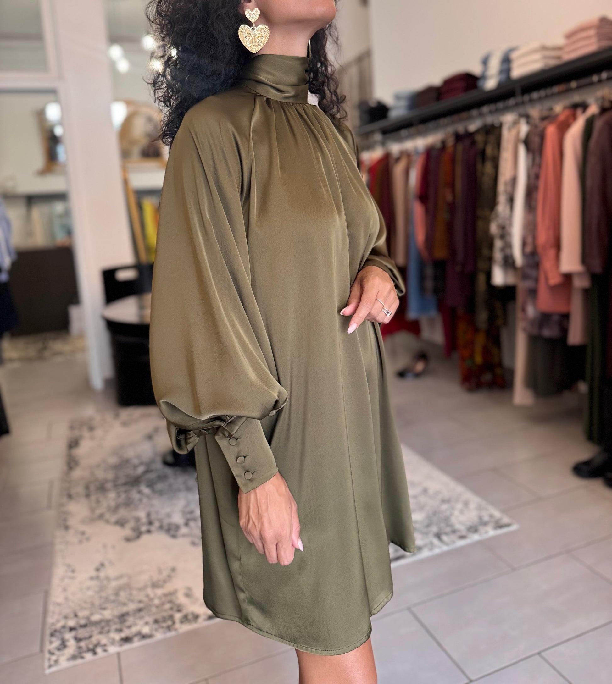 Colore military, collo a scialle che si lega dietro o si lascia morbido sul davanti . Polso con bottoncini .