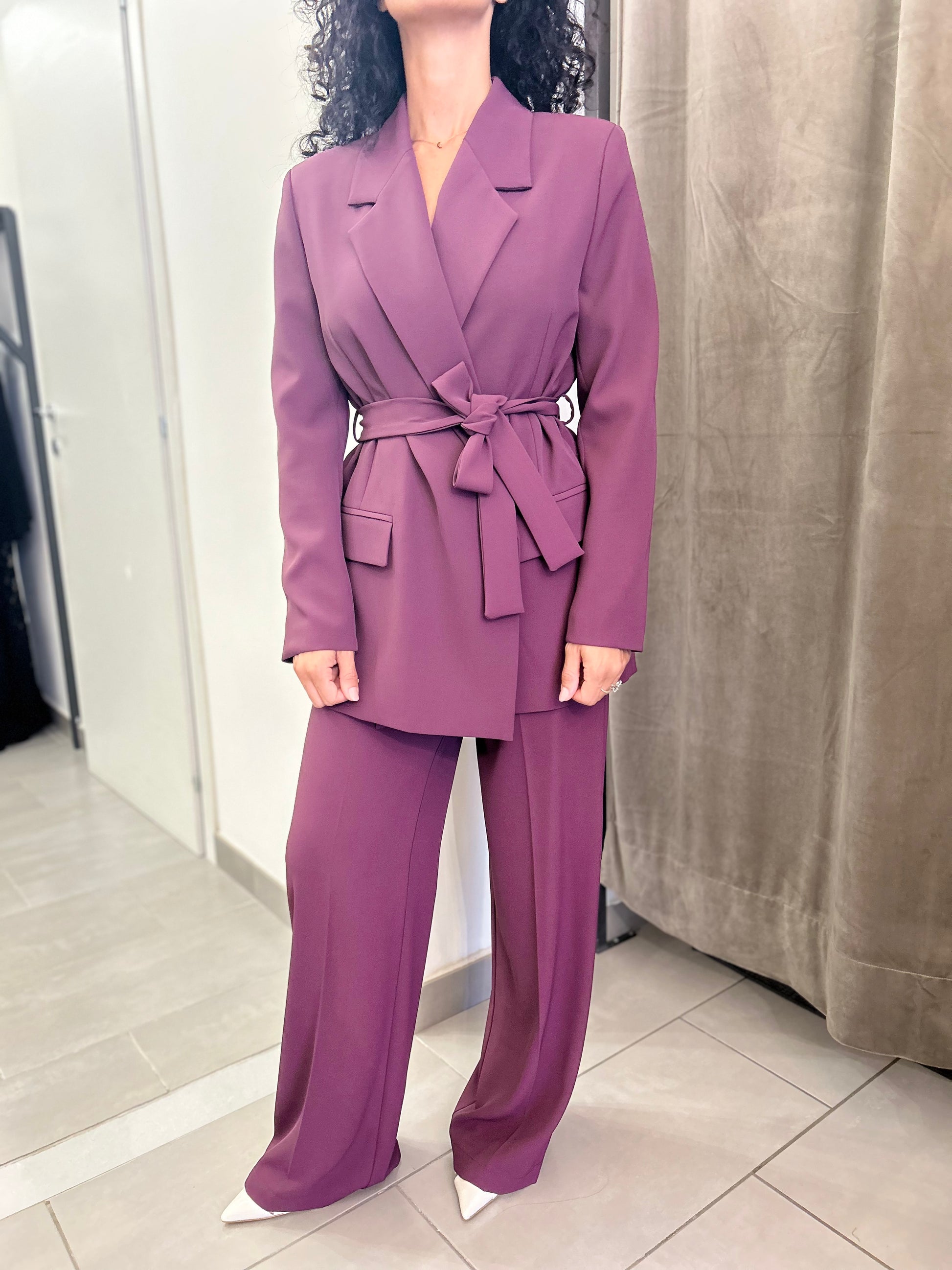 Blazer colore malva, Taglio lungo e avvolgente, con revers classico, con Cintura in tessuto da annodare in vita, che sottolinea la silhouette e aggiunge un tocco femminile. Tasche con patta applicata sul davanti, per un dettaglio sartoriale. Linea scivolata che dona eleganza e comfort.
