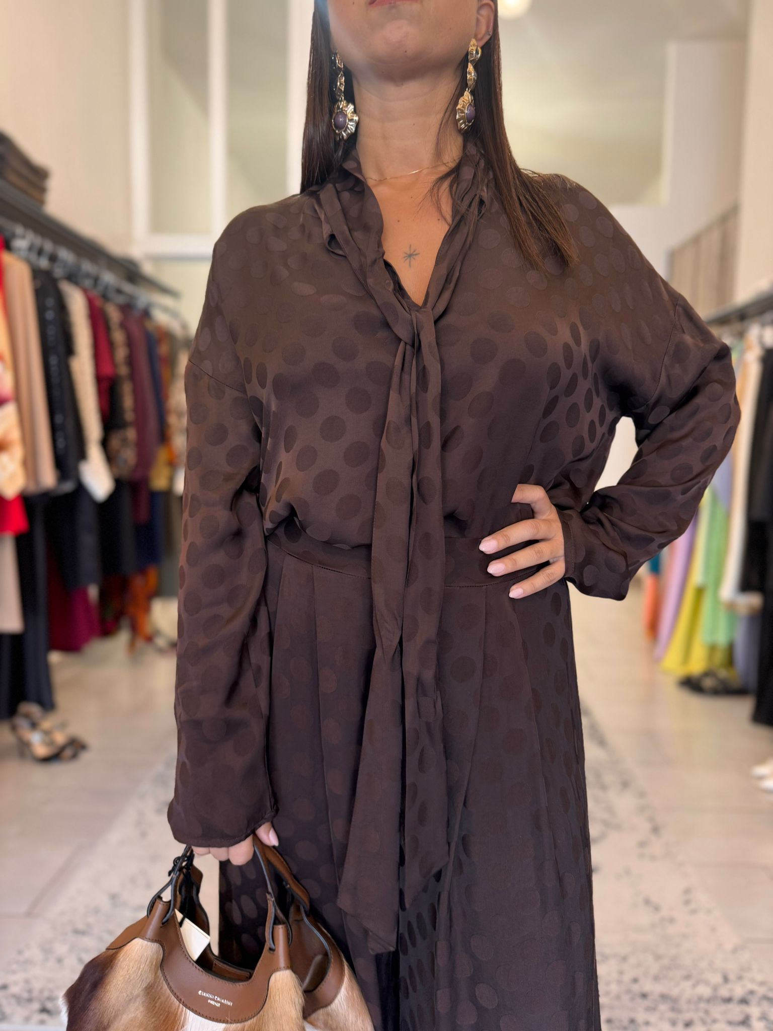 Camicia 100% viscosa con pois tono su tono nel colore marrone, morbida da annodare al collo o lasciare morbida
