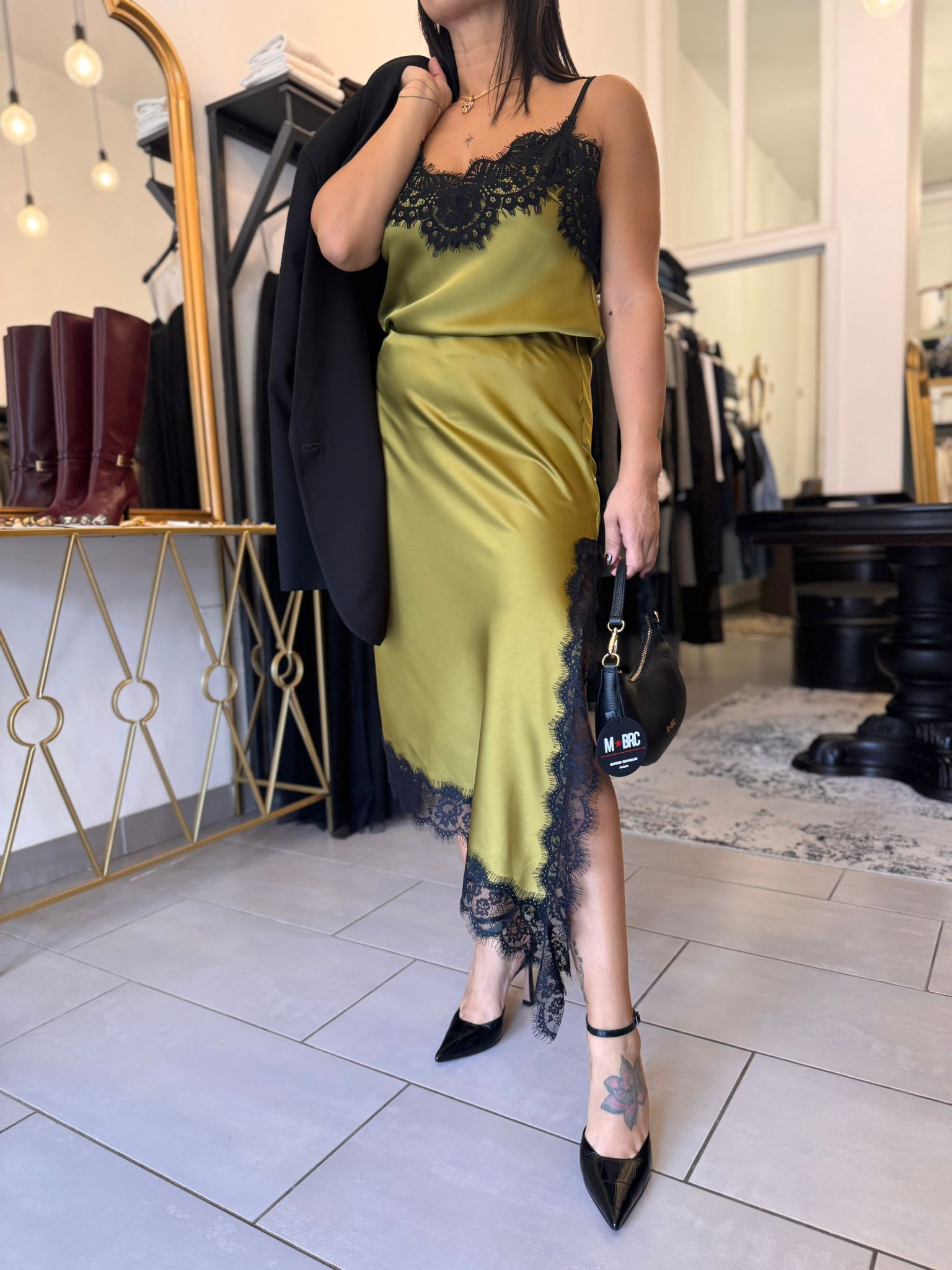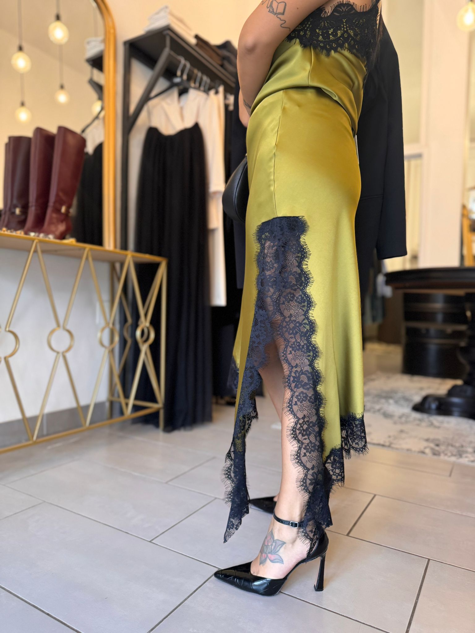 Gonna in Satin verde olio , con dettagli in pizzo nero, da abbinare anche con il suo top