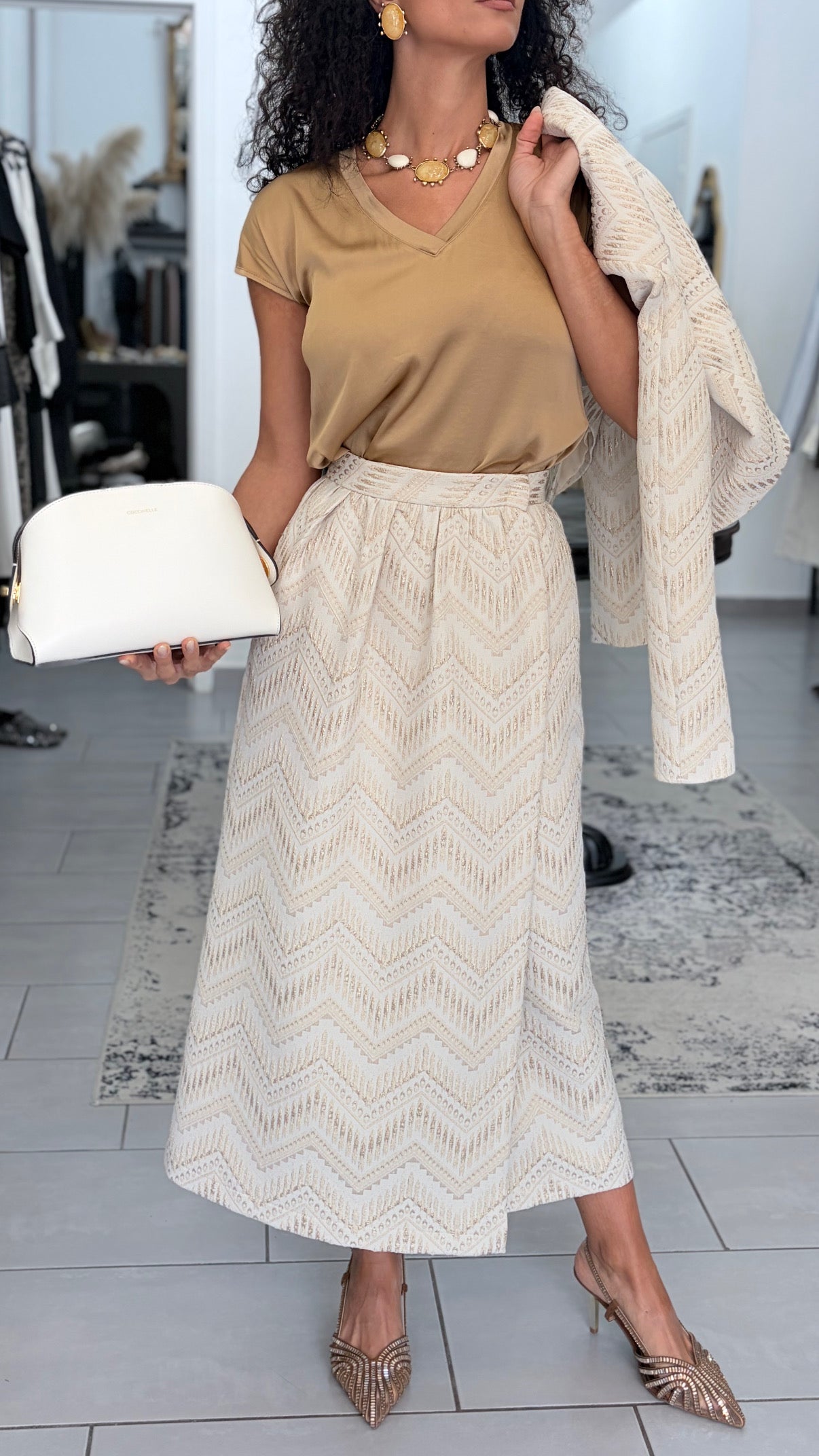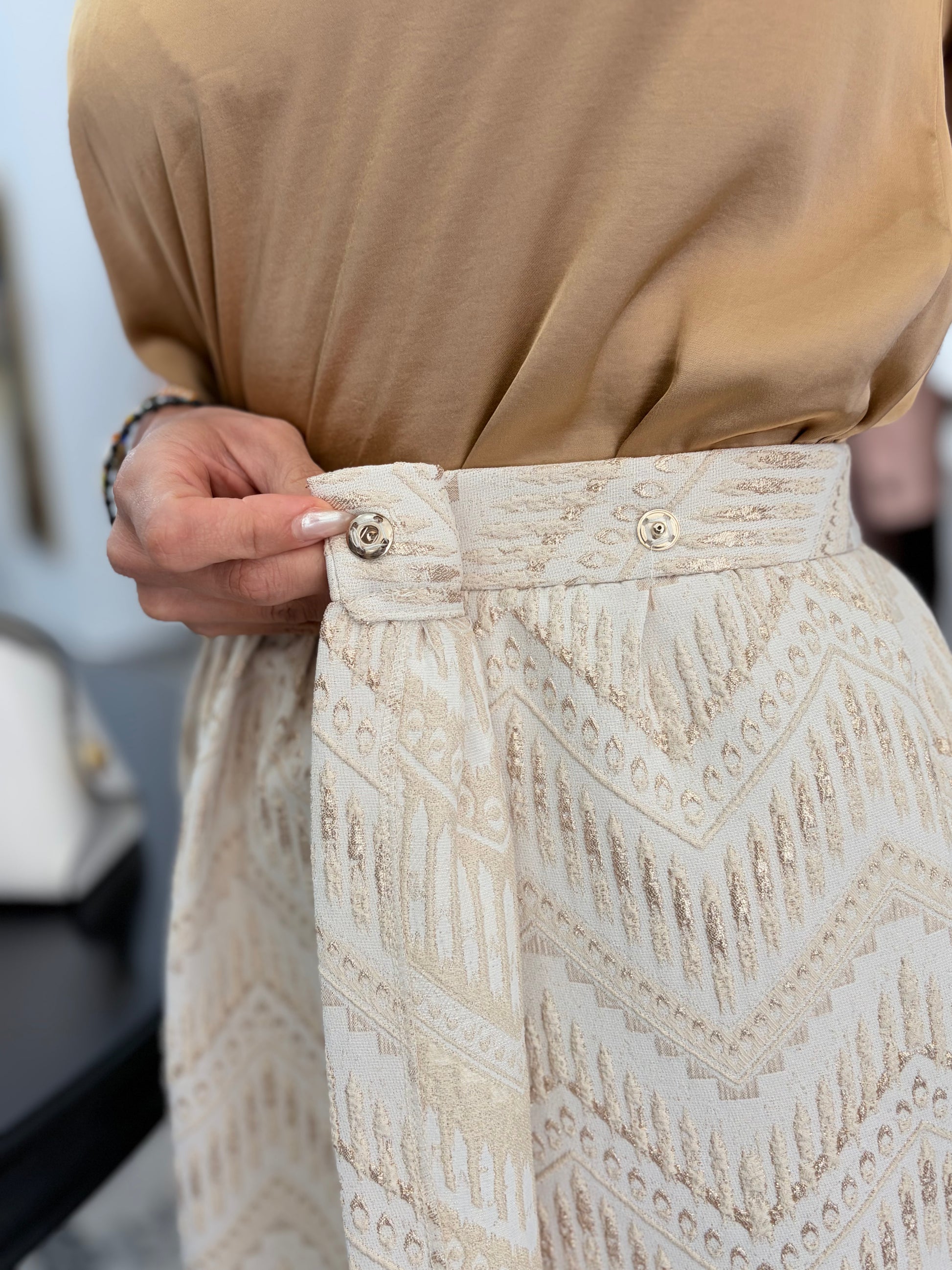 La gonna midi è realizzata in un raffinato tessuto jacquard con motivo geometrico tono su tono nelle delicate sfumature del beige e dell’avorio. Il design a vita alta valorizza la silhouette, mentre la linea leggermente svasata garantisce movimento e femminilità. Il dettaglio dei bottoni laterali in vita aggiunge un tocco ricercato e funzionale. Perfetta da abbinare a top essenziali o bluse eleganti, è un capo versatile ideale sia per look da giorno sofisticati che per occasioni più eleganti.