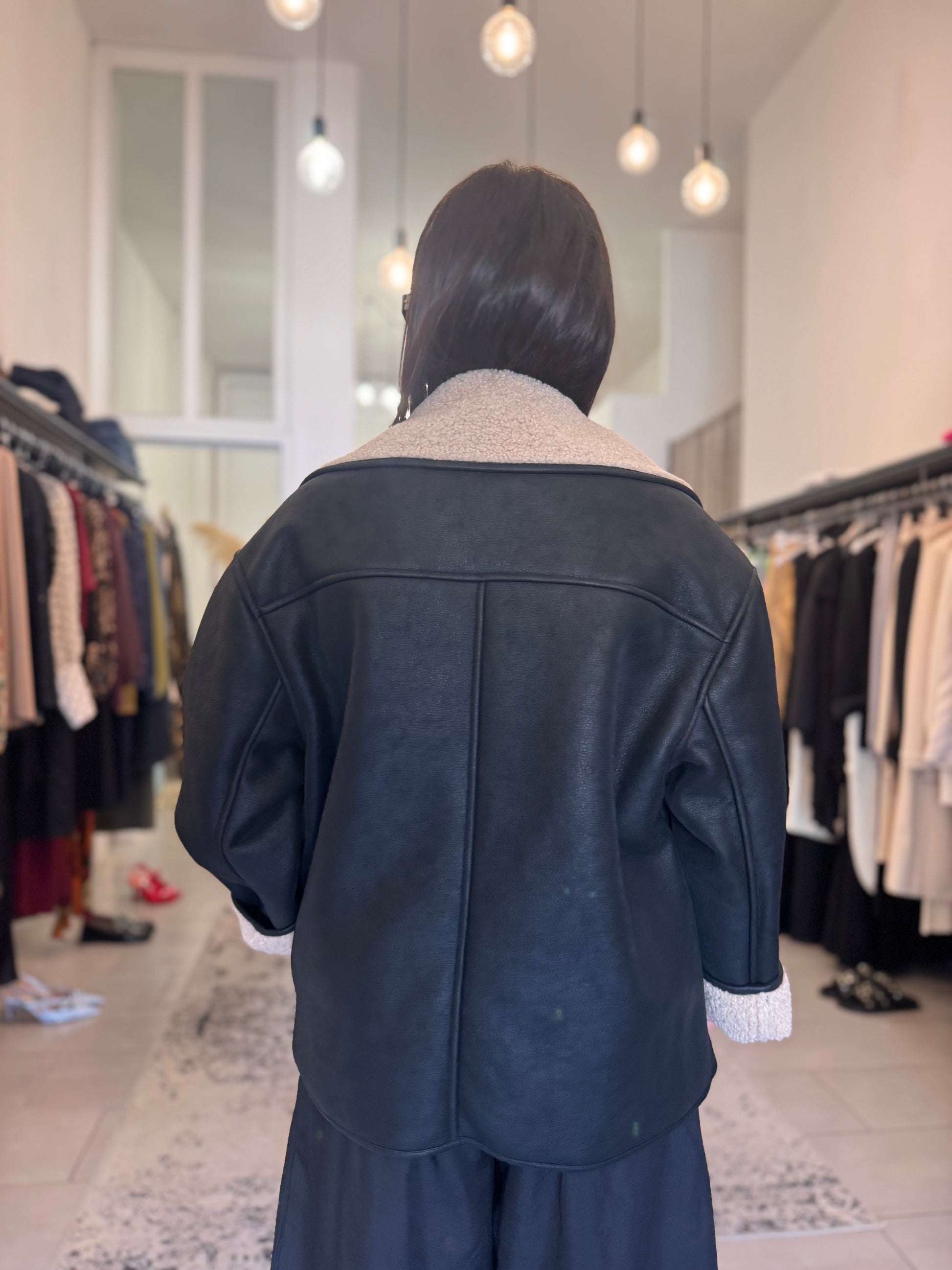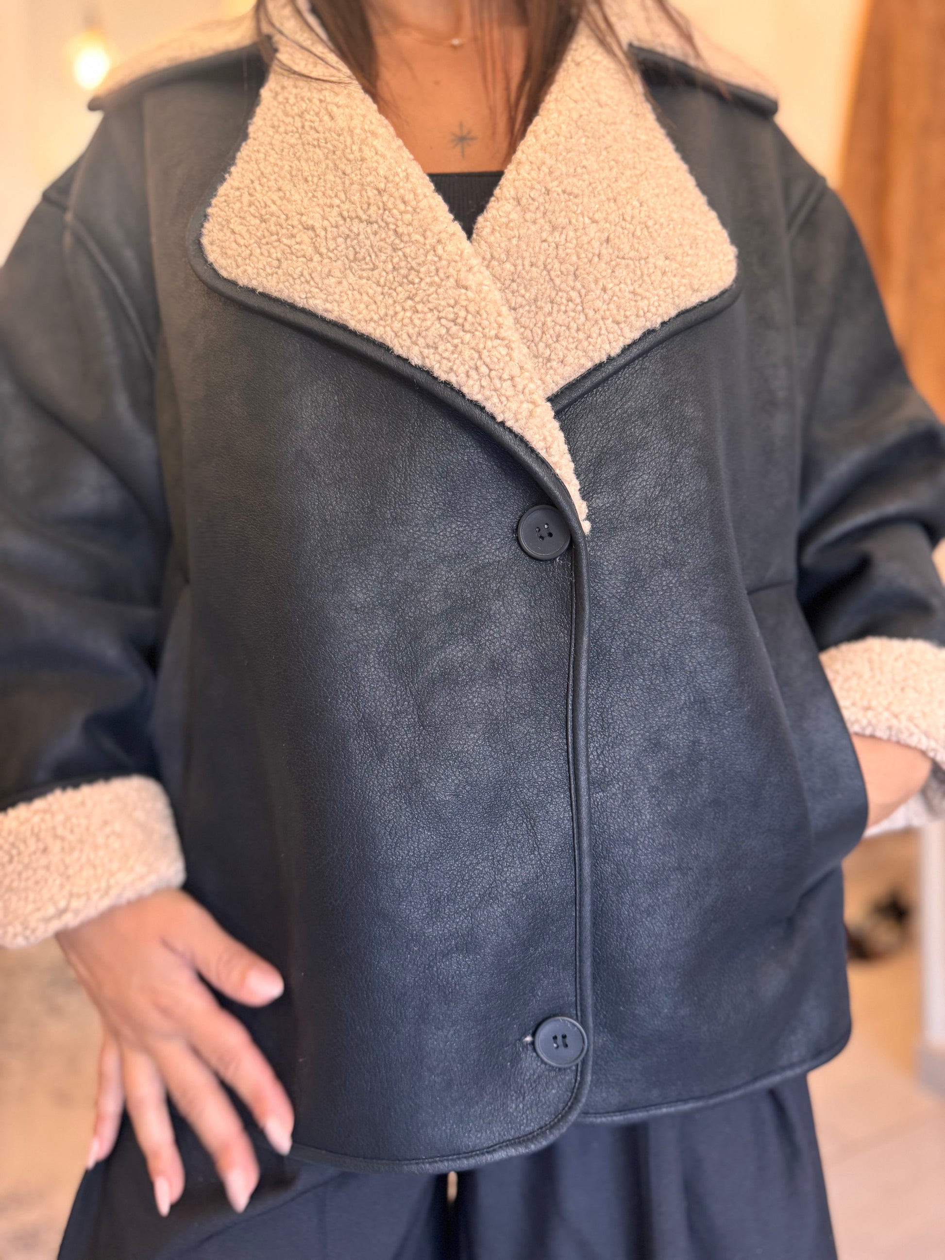 Nero con pelliccia interna bianca , polso risvoltabile , doppio petto
