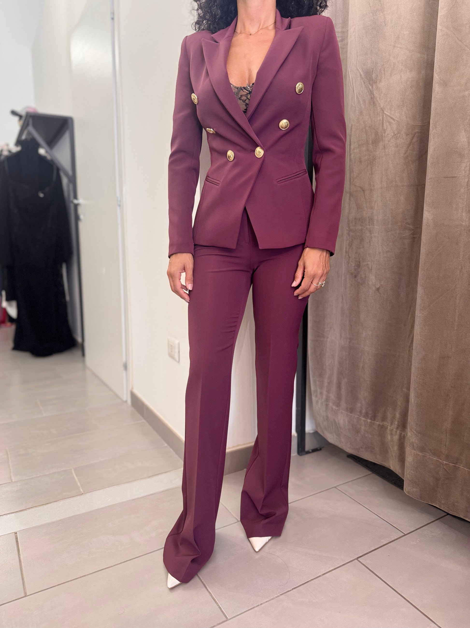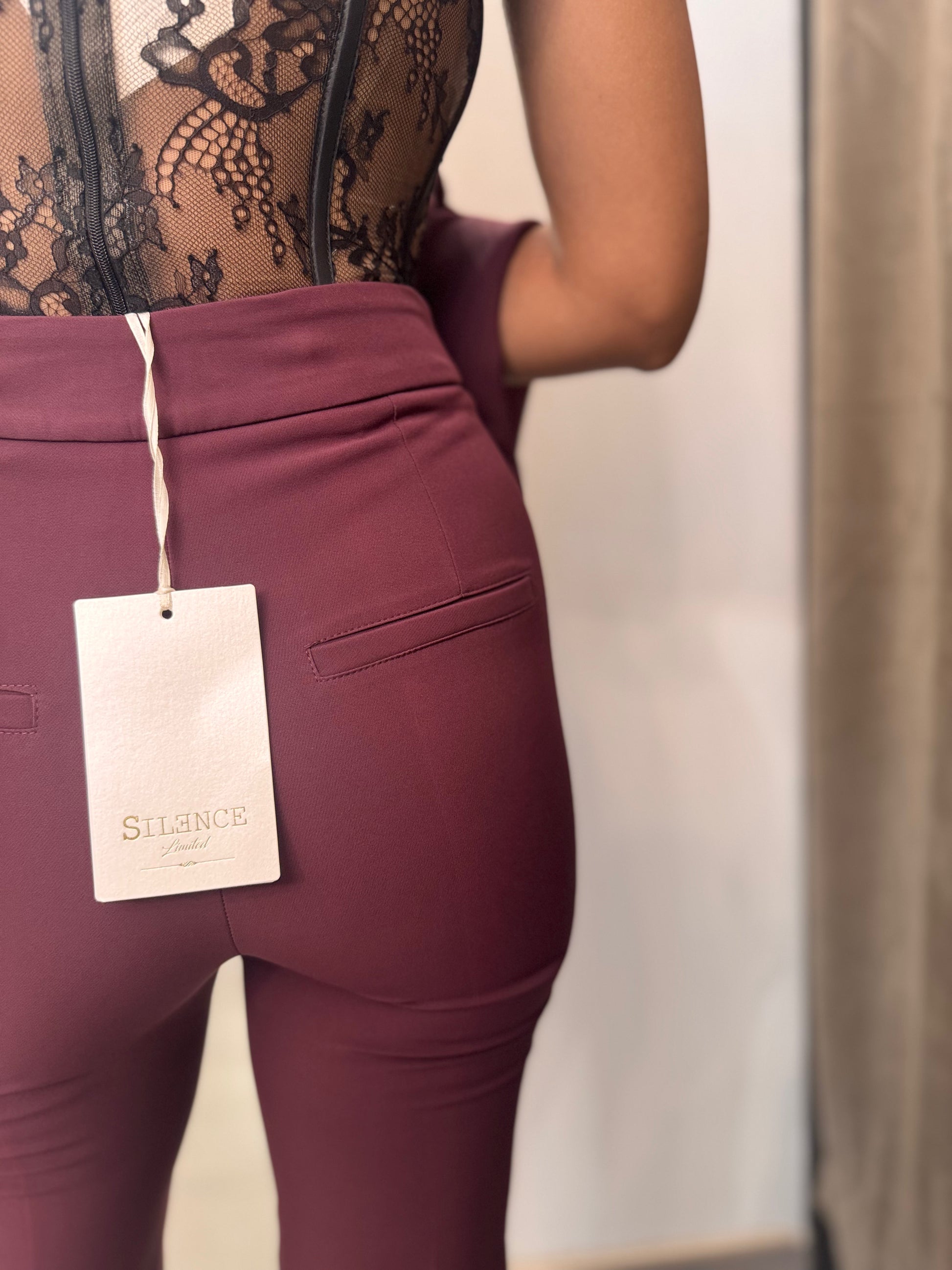 Il pantalone è un modello a vita alta, tinta unita bordeaux,in coordinato con il blazer. Vita alta, con una Linea aderente sulla parte superiore che valorizza le forme e a zampa sul fondo che slancia la figura e dona movimento. Tasche posteriori a filetto, discrete e raffinate.