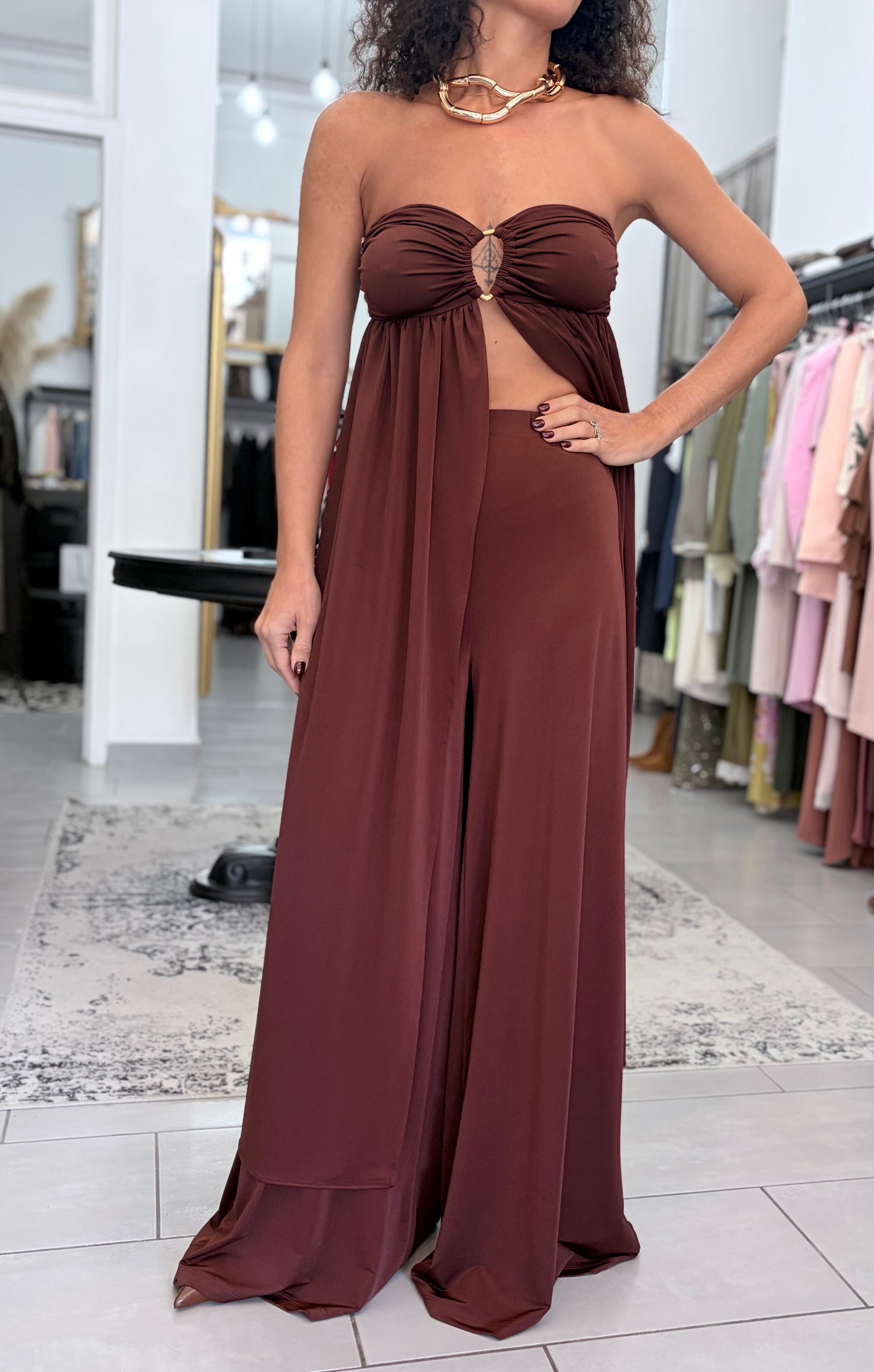 Pantaloni color marrone cioccolato, linea morbida e fluida da abbinare al loro top a fascia per un completo davvero originale