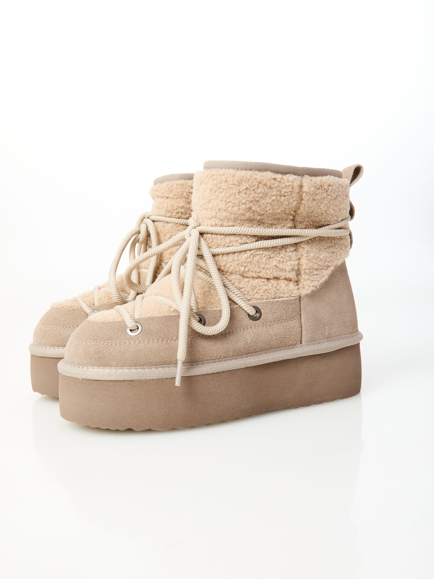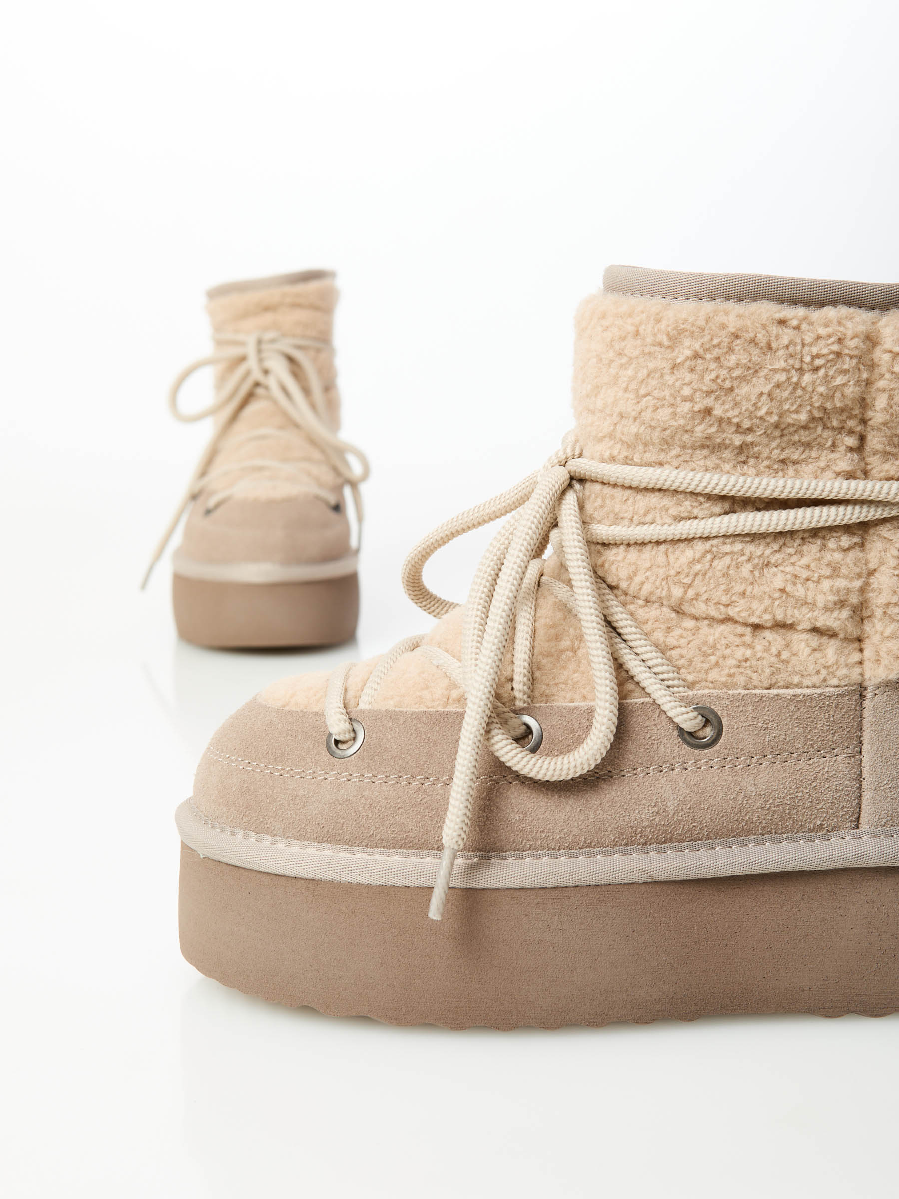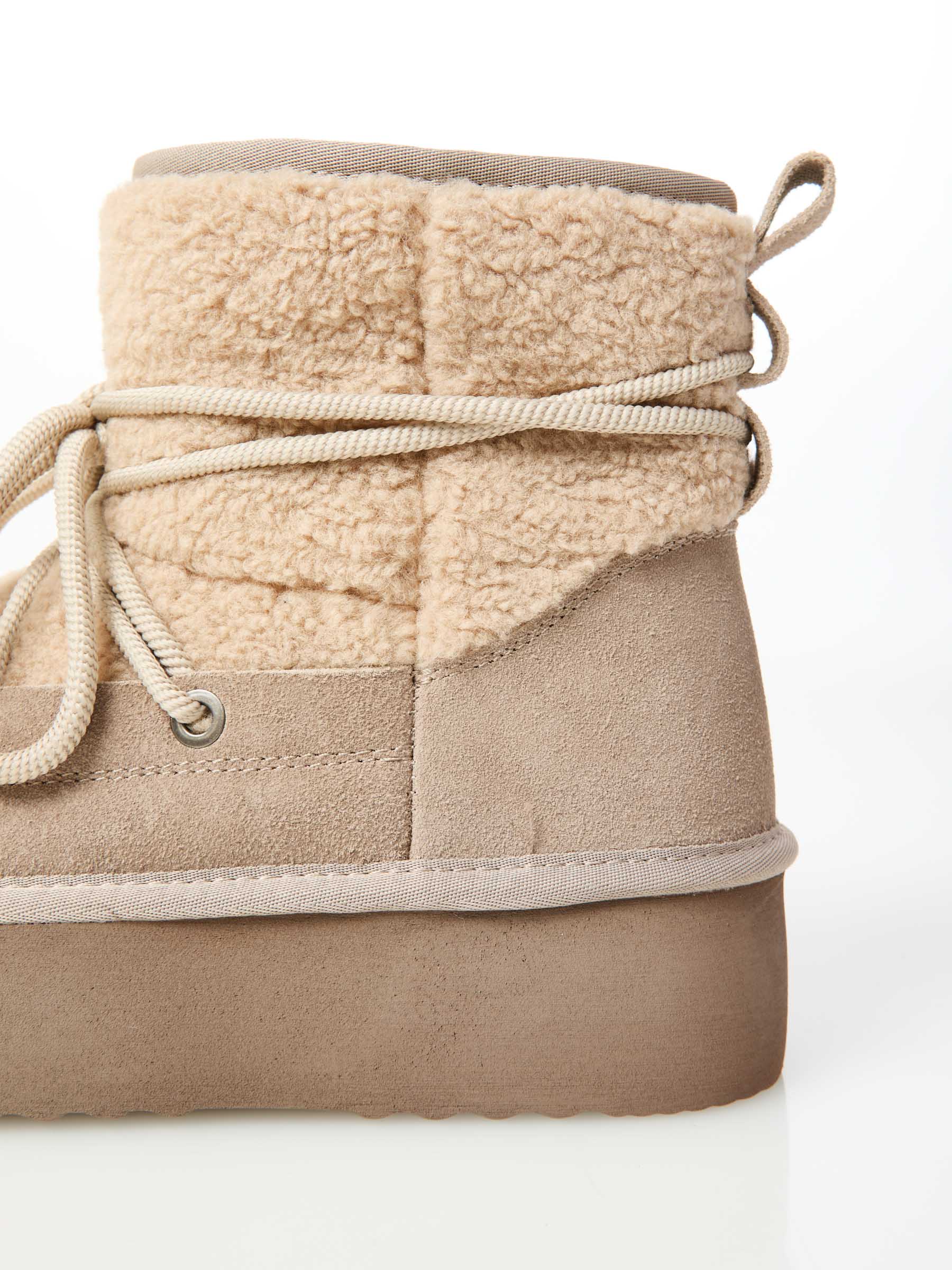 Stivaletto in camoscio, inserti in tessuto teddy, suola 5 cm