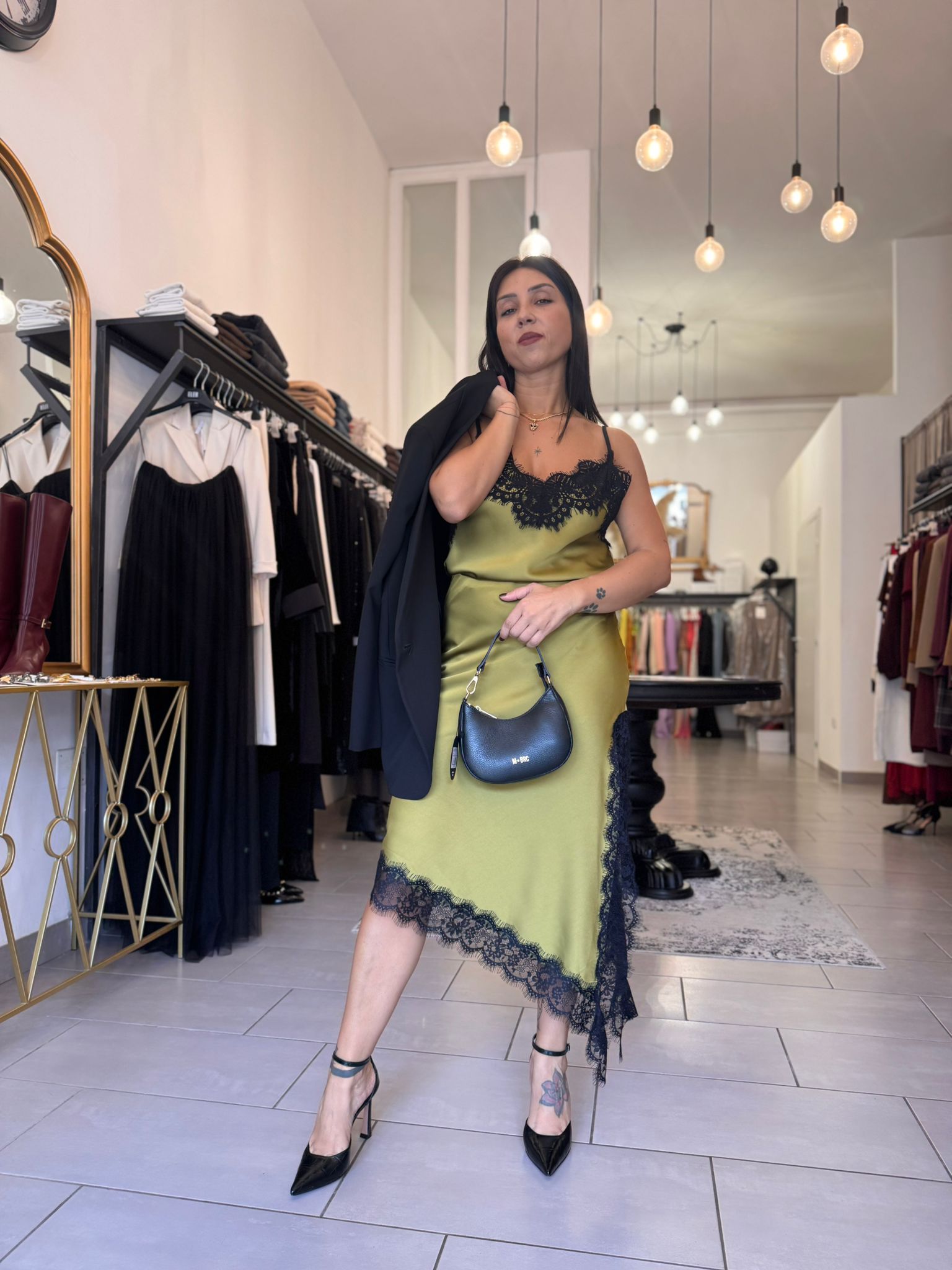 Top in satin verde olio con profili in pizzo nero, da abbinare con la sua gonna