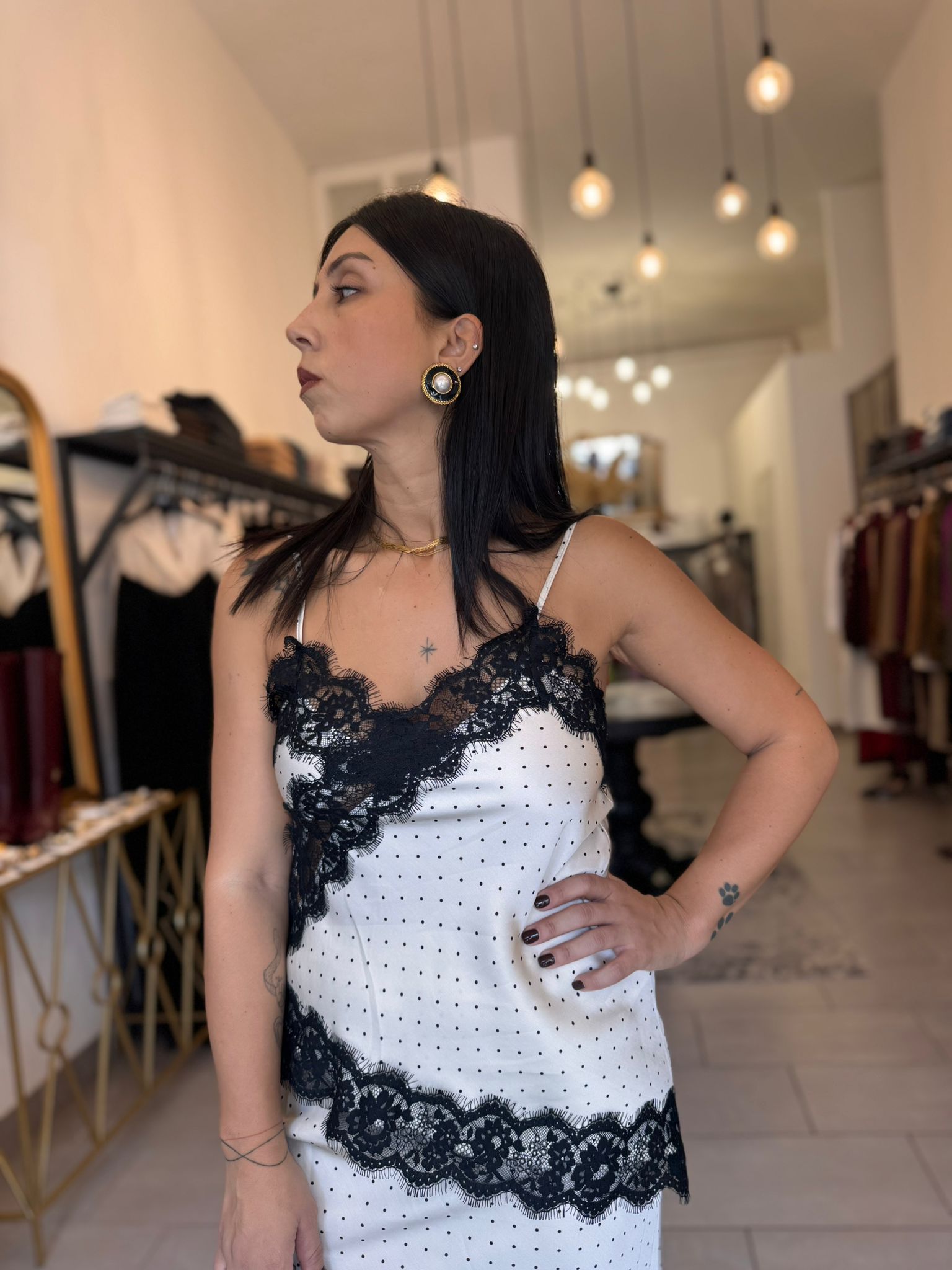 Top in satin con profilo in pizzo e micro pois, da abbinare con la sua gonna per creare un completo elegante . Fondo bianco con micro pois neri e pizzo nero.